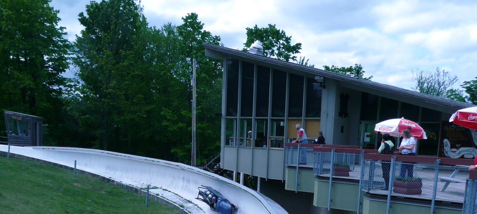 As part of the ride to Whiteface, Peter and I had a chance to ride the bobsled at Lake Placid. At this time of year the run a sled on wheels in the old bobsled…