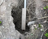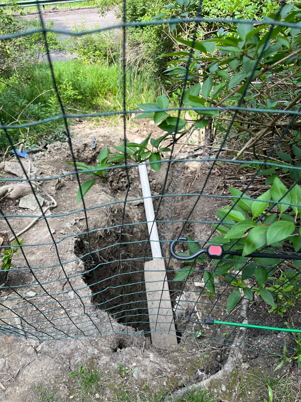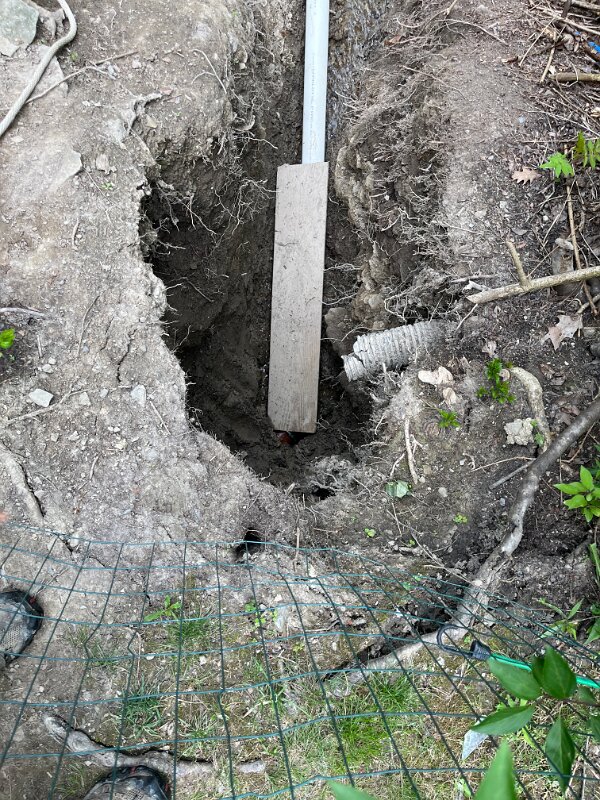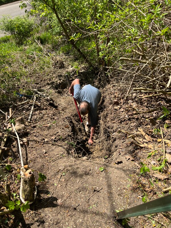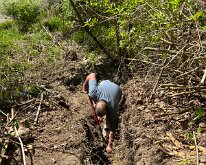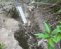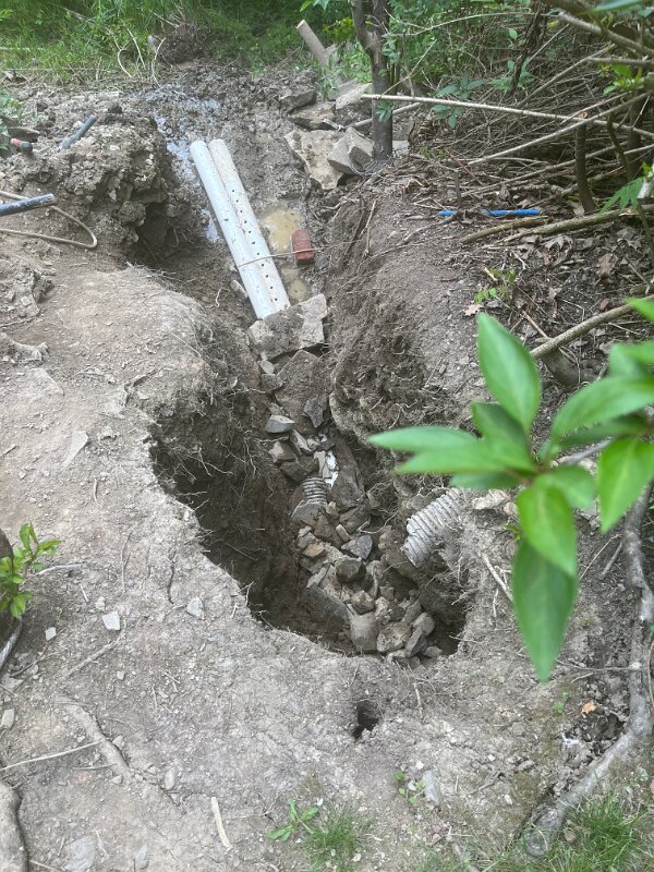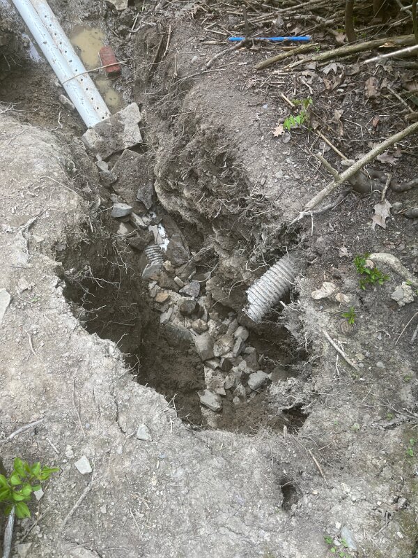 Digging out the front hillside to find the pipe that drains from basement. We could not clear it.