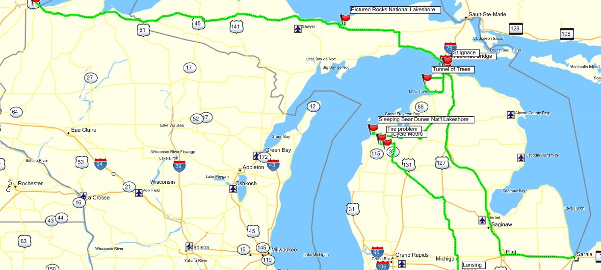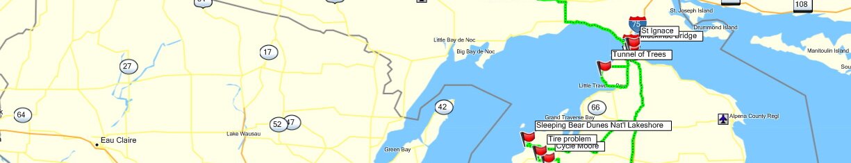 May 19-25. 2590 miles. Peter and I took long weekend trip to Duluth to look at Aerostich electric jacket liner. I picked up a few national park stamps along the way in MI and OH. Serious problem after Sleeping Bear in western MI when my front tire went suddenly flat. It turned out to be bad valve stem. Through some miracle, a nearby man had compressor and hot glue gun - yes he put gobs of hot glue on the stem to get it to stop leaking and then we were back on the road with some general directions but no plan. We found