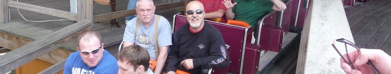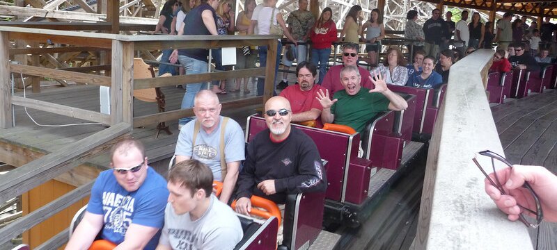 Lined up after arrival at Knoeblels. Always easy parking there even for large group. Heavy bumper cars - Ken's favorite. Would you get in the way of this man? Frank is very tall. He was a good sport at getting on this ride with me although he had difficulty with long legs of readching the brake pedal to get the thing to roll.