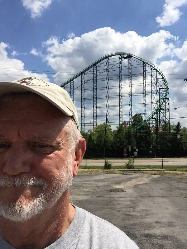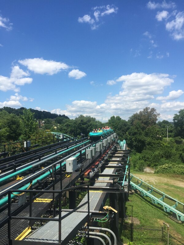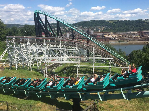 Phantom's Revenge drops down hillside Thunderbolt in background