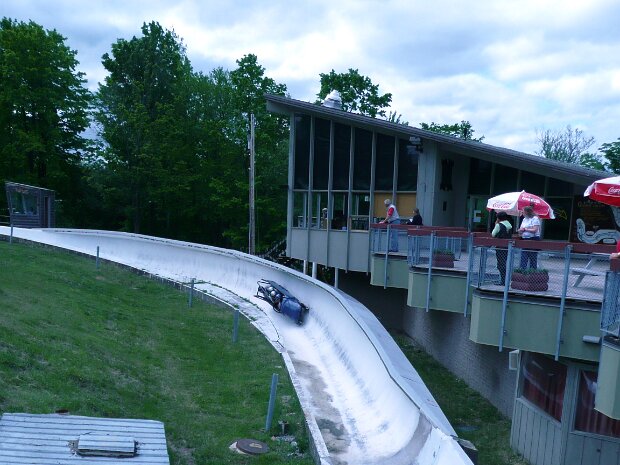 As part of the ride to Whiteface, Peter and I had a chance to ride the bobsled at Lake Placid. At this time of year the run a sled on wheels in the old bobsled…