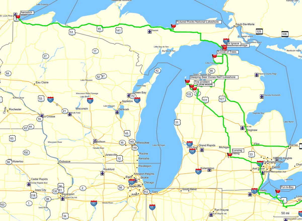 May 19-25. 2590 miles. Peter and I took long weekend trip to Duluth to look at Aerostich electric jacket liner. I picked up a few national park stamps along the way in MI and OH. Serious problem after Sleeping Bear in western MI when my front tire went suddenly flat. It turned out to be bad valve stem. Through some miracle, a nearby man had compressor and hot glue gun - yes he put gobs of hot glue on the stem to get it to stop leaking and then we were back on the road with some general directions but no plan. We found