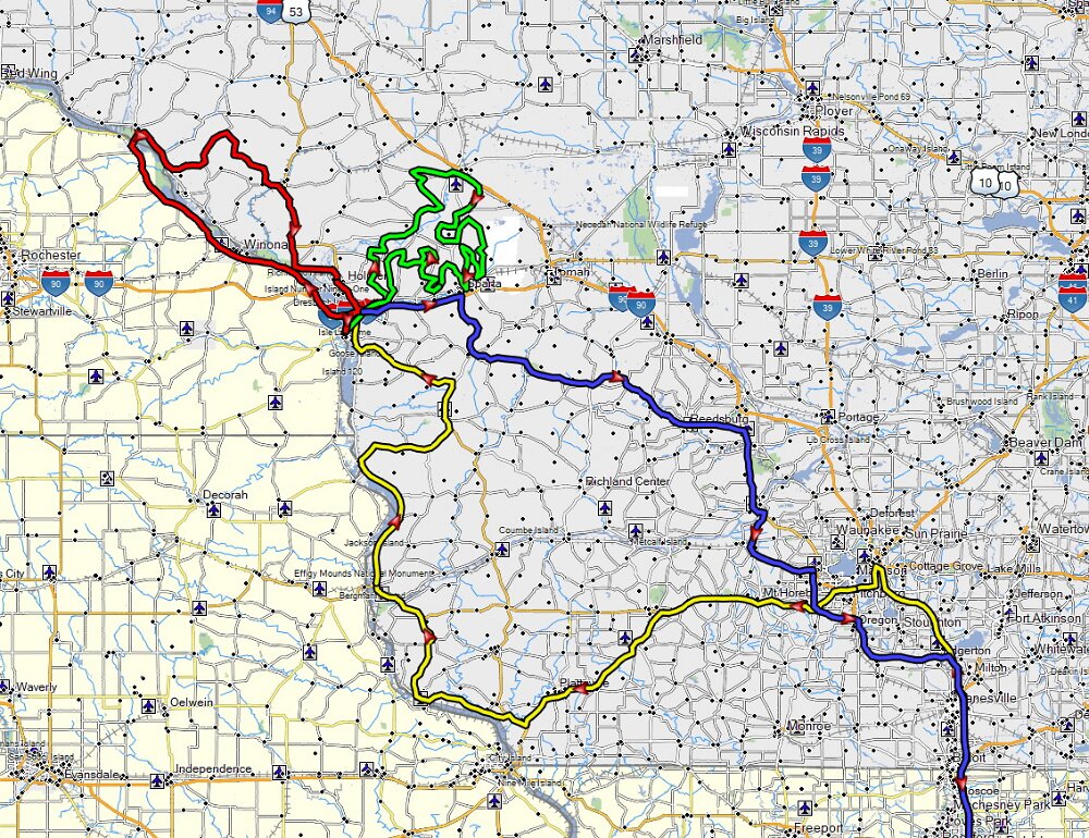 La Crosse WI for summer ride with MTF. Green route on Tuesday, red on Thursday with group.