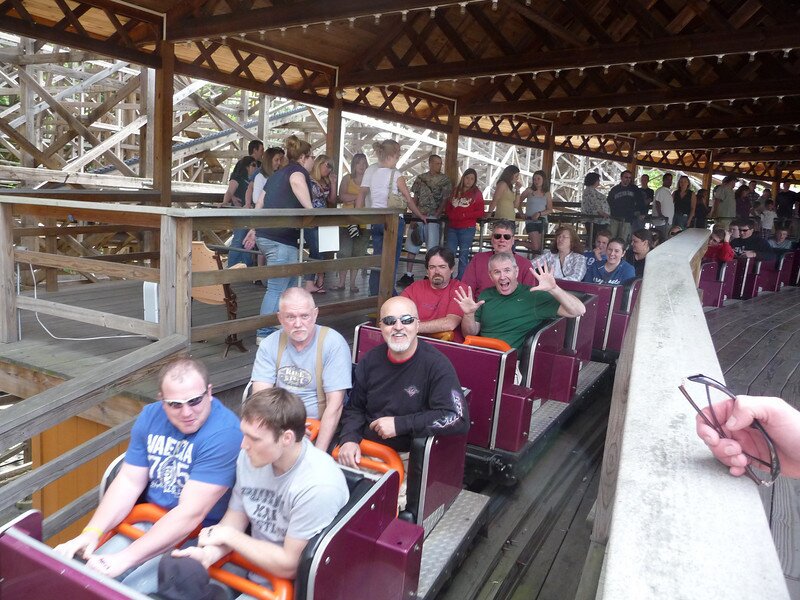 Lined up after arrival at Knoeblels. Always easy parking there even for large group. Heavy bumper cars - Ken's favorite. Would you get in the way of this man? Frank is very tall. He was a good sport at getting on this ride with me although he had difficulty with long legs of readching the brake pedal to get the thing to roll.
